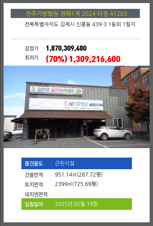 사건번호 2024 타경 41203 본건은 전북특별자치도 김제시 신풍동 439-3 1동외 1필지소재하는 근린시설경매 물건의 포스팅입니다. 건물면적 [ 951.14㎡ (287.72평) ]토지면적 [ 2399㎡ (725.69평) ] 시세를 반영한