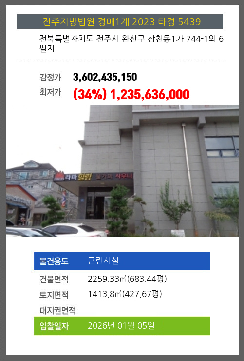 사건번호 2023 타경 5439 본건은 전북특별자치도 전주시 완산구 삼천동1가 744-1외 6필지소재하는 근린시설경매 물건의 포스팅입니다. 건물면적 [ 2259.33㎡ (683.44평) ]토지면적 [ 1413.8㎡ (427.67평) ] 시세를 반영한