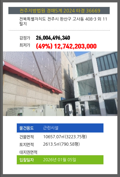 사건번호 2024 타경 36669 본건은 전북특별자치도 전주시 완산구 고사동 408-3 외 11필지소재하는 근린시설경매 물건의 포스팅입니다. 건물면적 [ 10657.07㎡ (3223.75평) ]토지면적 [ 2613.5㎡ (790.58평) ] 시세를