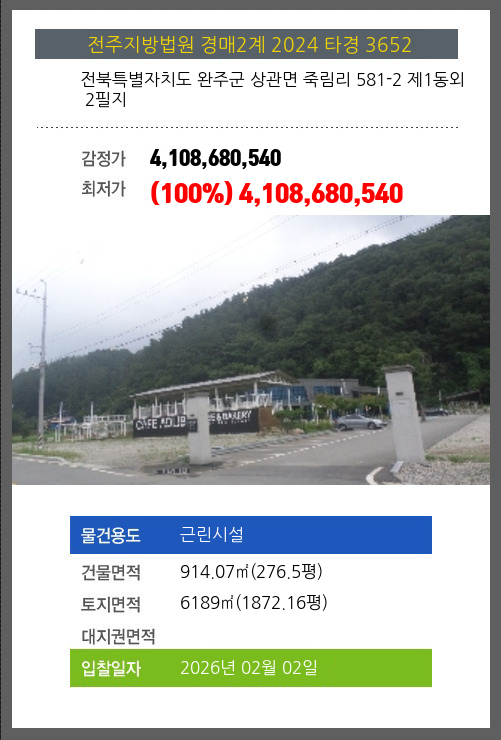 사건번호 2024 타경 3652 본건은 전북특별자치도 완주군 상관면 죽림리 581-2 제1동외 2필지소재하는 근린시설경매 물건의 포스팅입니다. 건물면적 [ 914.07㎡ (276.5평) ]토지면적 [ 6189㎡ (1872.16평) ] 시세를