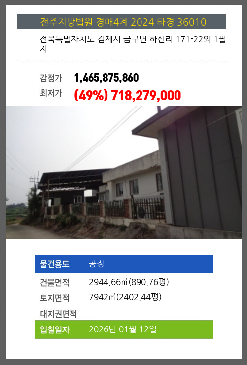 사건번호 2024 타경 36010 본건은 전북특별자치도 김제시 금구면 하신리 171-22외 1필지소재하는 공장경매 물건의 포스팅입니다. 건물면적 [ 2944.66㎡ (890.76평) ]토지면적 [ 7942㎡ (2402.44평) ] 시세를 반영한