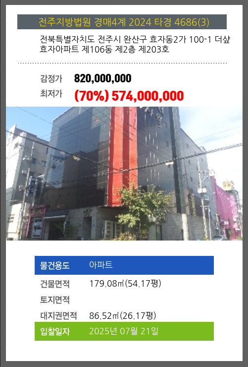 사건번호 2024 타경 4686(3) 본건은 전북특별자치도 전주시 완산구 효자동2가 100-1 더샾효자아파트 제106동 제2층 제203호소재하는 아파트경매 물건의 포스팅입니다. 건물면적 [ 179.08㎡ (54.17평) ]대지권 [ 86.52㎡ (26.17평)