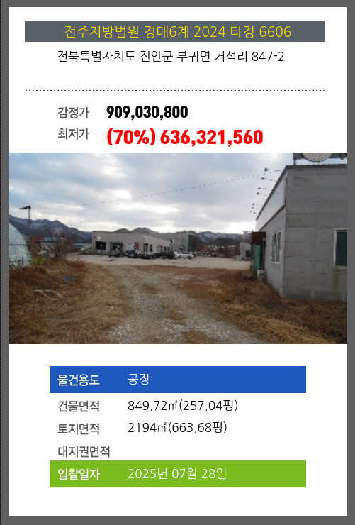 사건번호 2024 타경 6606 본건은 전북특별자치도 진안군 부귀면 거석리 847-2소재하는 공장경매 물건의 포스팅입니다. 건물면적 [ 849.72㎡ (257.04평) ]토지면적 [ 2194㎡ (663.68평) ] 시세를 반영한 감정가
