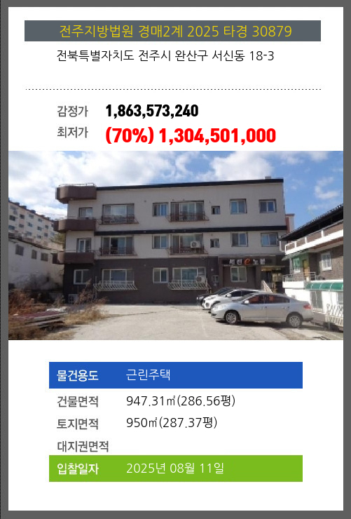 사건번호 2025 타경 30879 본건은 전북특별자치도 전주시 완산구 서신동 18-3소재하는 근린주택경매 물건의 포스팅입니다. 건물면적 [ 947.31㎡ (286.56평) ]토지면적 [ 950㎡ (287.37평) ] 시세를 반영한 감정가