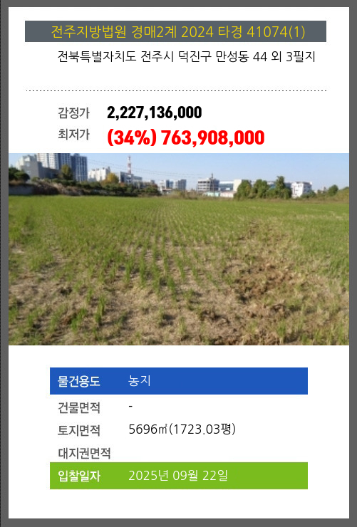 사건번호 2024 타경 41074(1) 본건은 전북특별자치도 전주시 덕진구 만성동 44 외 3필지소재하는 농지경매 물건의 포스팅입니다. 토지면적 [ 5696㎡ (1723.03평) ] 시세를 반영한 감정가 2,227,136,000에서3회 유찰되어