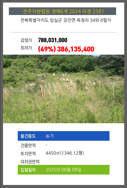 사건번호 2024 타경 2581 본건은 전북특별자치도 임실군 강진면 옥정리 34외 6필지소재하는 농지경매 물건의 포스팅입니다. 토지면적 [ 4450㎡ (1346.12평) ] 시세를 반영한 감정가 788,031,000에서2회 유찰되어 감정가
