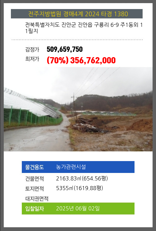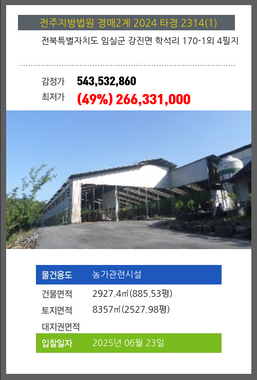 사건번호 2024 타경 2314(1) 본건은 전북특별자치도 임실군 강진면 학석리 170-1외 4필지소재하는 농가관련시설경매 물건의 포스팅입니다. 건물면적 [ 2927.4㎡ (885.53평) ]토지면적 [ 8357㎡ (2527.98평) ] 시세를 반영한
