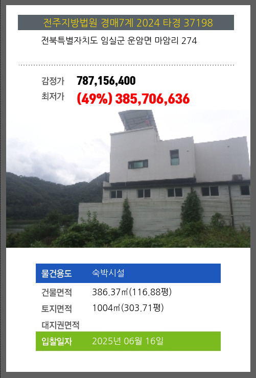 사건번호 2024 타경 37198 본건은 전북특별자치도 임실군 운암면 마암리 274소재하는 숙박시설경매 물건의 포스팅입니다. 건물면적 [ 386.37㎡ (116.88평) ]토지면적 [ 1004㎡ (303.71평) ] 시세를 반영한 감정가