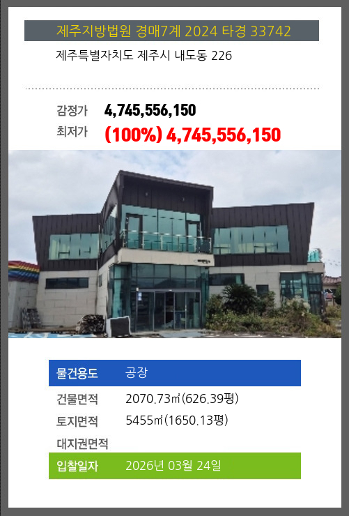 사건번호 2024 타경 33742 본건은 제주특별자치도 제주시 내도동 226소재하는 공장경매 물건의 포스팅입니다. 건물면적 [ 2070.73㎡ (626.39평) ]토지면적 [ 5455㎡ (1650.13평) ] 시세를 반영한 감정가 4,745,556,150에서신건으로
