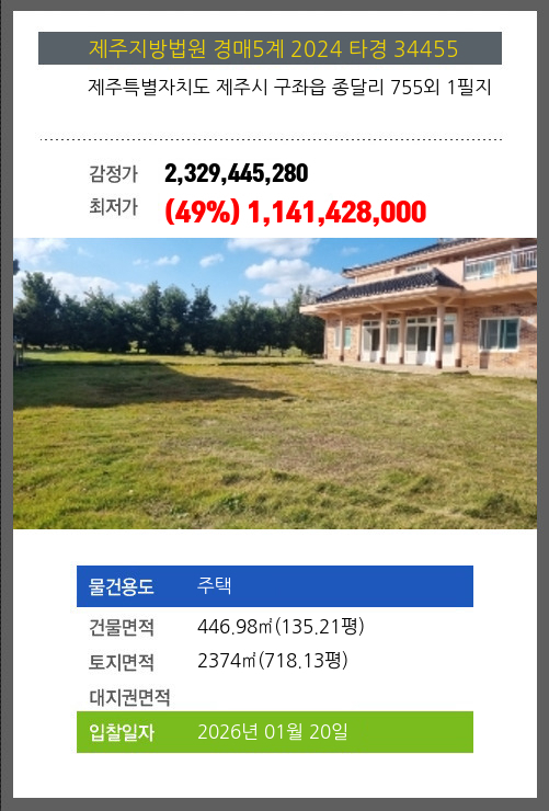 사건번호 2024 타경 34455 본건은 제주특별자치도 제주시 구좌읍 종달리 755외 1필지소재하는 주택경매 물건의 포스팅입니다. 건물면적 [ 446.98㎡ (135.21평) ]토지면적 [ 2374㎡ (718.13평) ] 시세를 반영한