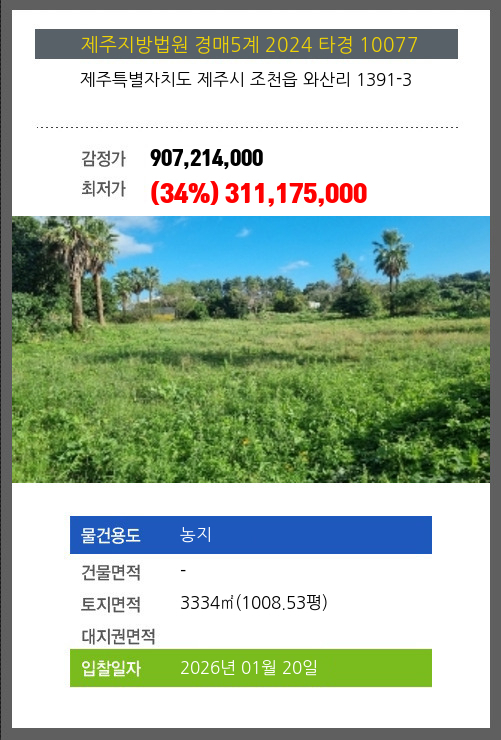 사건번호 2024 타경 10077 본건은 제주특별자치도 제주시 조천읍 와산리 1391-3소재하는 농지경매 물건의 포스팅입니다. 토지면적 [ 3334㎡ (1008.53평) ] 시세를 반영한 감정가 907,214,000에서3회 유찰되어 감정가 대비