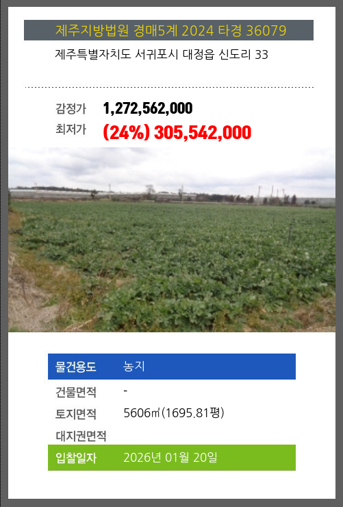 사건번호 2024 타경 36079 본건은 제주특별자치도 서귀포시 대정읍 신도리 33소재하는 농지경매 물건의 포스팅입니다. 토지면적 [ 5606㎡ (1695.81평) ] 시세를 반영한 감정가 1,272,562,000에서4회 유찰되어 감정가 대비