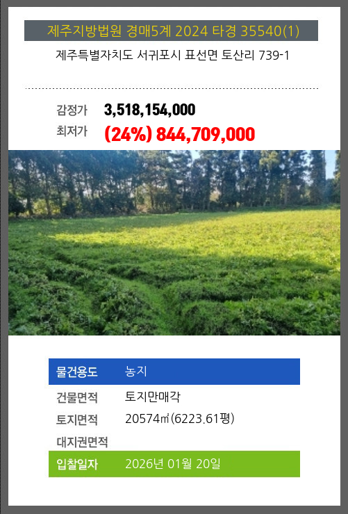사건번호 2024 타경 35540(1) 본건은 제주특별자치도 서귀포시 표선면 토산리 739-1소재하는 농지경매 물건의 포스팅입니다. 건물면적 [ 토지만매각 ]토지면적 [ 20574㎡ (6223.61평) ] 시세를 반영한 감정가 3,518,154,000에서4회