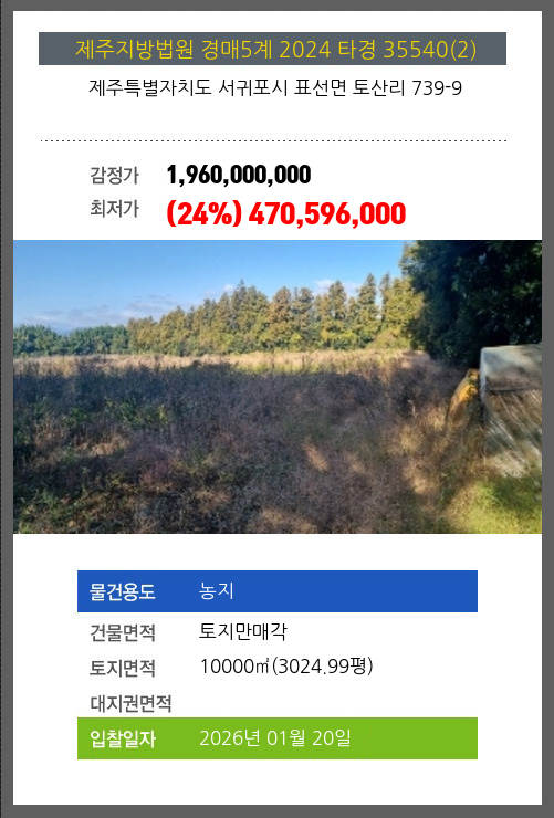 사건번호 2024 타경 35540(2) 본건은 제주특별자치도 서귀포시 표선면 토산리 739-9소재하는 농지경매 물건의 포스팅입니다. 건물면적 [ 토지만매각 ]토지면적 [ 10000㎡ (3024.99평) ] 시세를 반영한 감정가 1,960,000,000에서4회