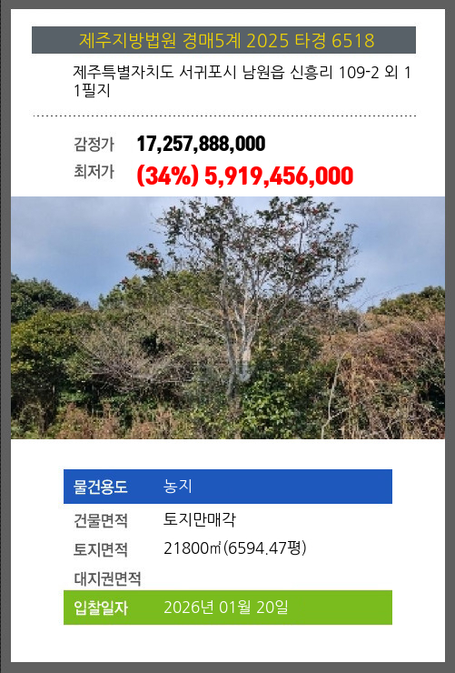 사건번호 2025 타경 6518 본건은 제주특별자치도 서귀포시 남원읍 신흥리 109-2 외 11필지소재하는 농지경매 물건의 포스팅입니다. 건물면적 [ 토지만매각 ]토지면적 [ 21800㎡ (6594.47평) ] 시세를 반영한