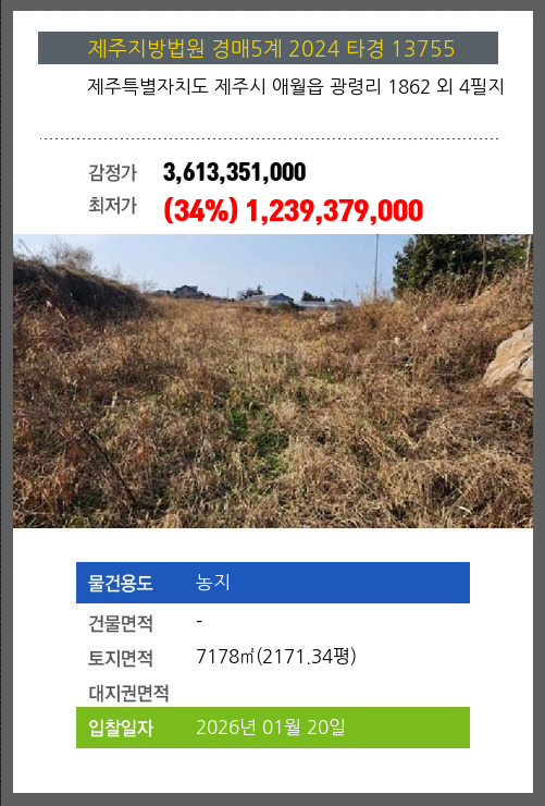 사건번호 2024 타경 13755 본건은 제주특별자치도 제주시 애월읍 광령리 1862 외 4필지소재하는 농지경매 물건의 포스팅입니다. 토지면적 [ 7178㎡ (2171.34평) ] 시세를 반영한 감정가 3,613,351,000에서3회 유찰되어