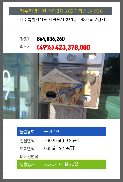 사건번호 2024 타경 34936 본건은 제주특별자치도 서귀포시 하예동 148-5외 2필지소재하는 근린주택경매 물건의 포스팅입니다. 건물면적 [ 230.93㎡ (69.86평) ]토지면적 [ 638㎡ (192.99평) ] 시세를 반영한 감정가
