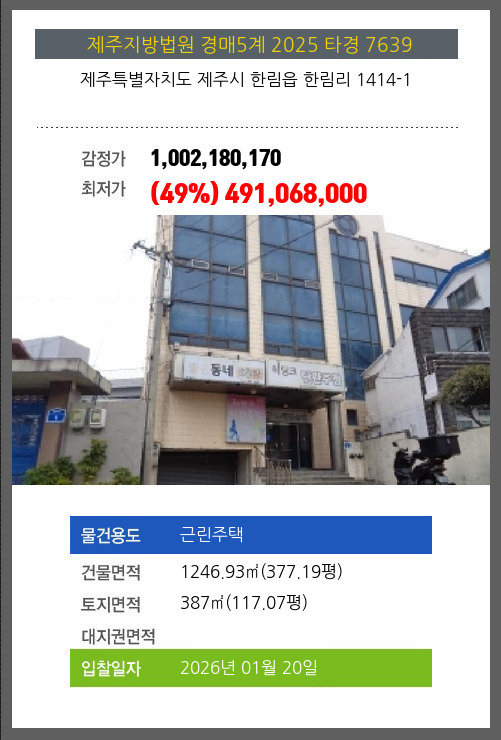 사건번호 2025 타경 7639 본건은 제주특별자치도 제주시 한림읍 한림리 1414-1소재하는 근린주택경매 물건의 포스팅입니다. 건물면적 [ 1246.93㎡ (377.19평) ]토지면적 [ 387㎡ (117.07평) ] 시세를 반영한 감정가
