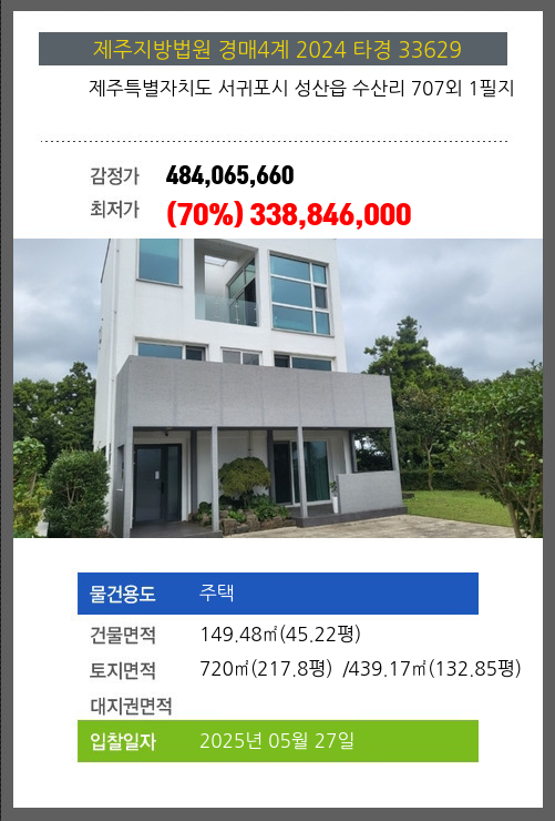 사건번호 2024 타경 33629 본건은 제주특별자치도 서귀포시 성산읍 수산리 707외 1필지소재하는 주택경매 물건의 포스팅입니다. 건물면적 [ 149.48㎡ (45.22평) ]토지면적 [ 전체:720㎡ (217.8평) 매각지분:439.17㎡ (132.85평) ]