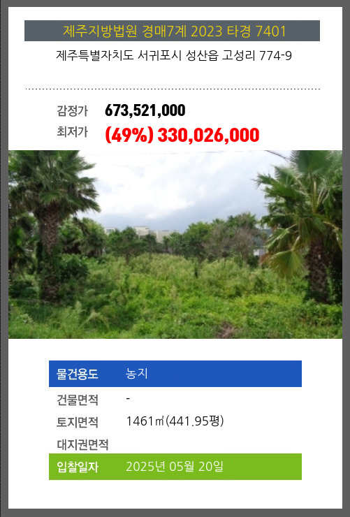 사건번호 2023 타경 7401 본건은 제주특별자치도 서귀포시 성산읍 고성리 774-9소재하는 농지경매 물건의 포스팅입니다. 토지면적 [ 1461㎡ (441.95평) ] 시세를 반영한 감정가 673,521,000에서2회 유찰되어 감정가 대비