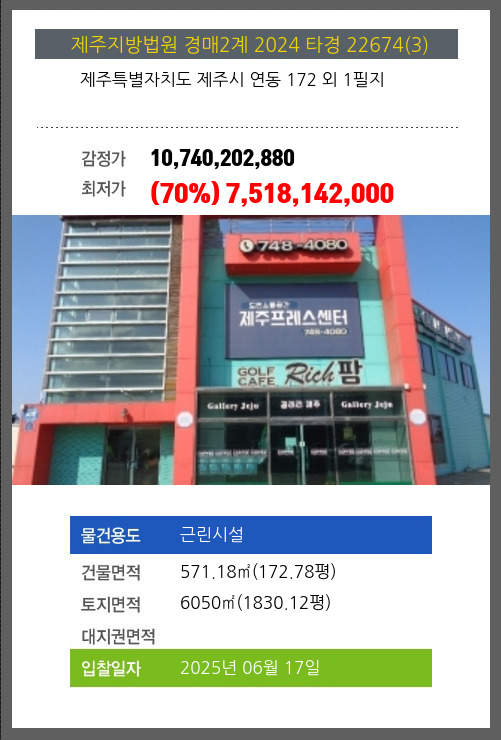 사건번호 2024 타경 22674(3) 본건은 제주특별자치도 제주시 연동 172 외 1필지소재하는 근린시설경매 물건의 포스팅입니다. 건물면적 [ 571.18㎡ (172.78평) ]토지면적 [ 6050㎡ (1830.12평) ] 시세를 반영한