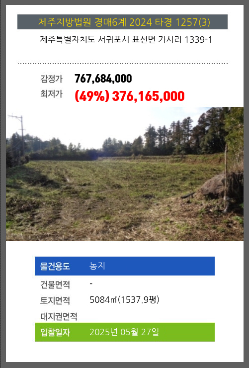 사건번호 2024 타경 1257(3) 본건은 제주특별자치도 서귀포시 표선면 가시리 1339-1소재하는 농지경매 물건의 포스팅입니다. 토지면적 [ 5084㎡ (1537.9평) ] 시세를 반영한 감정가 767,684,000에서2회 유찰되어 감정가 대비