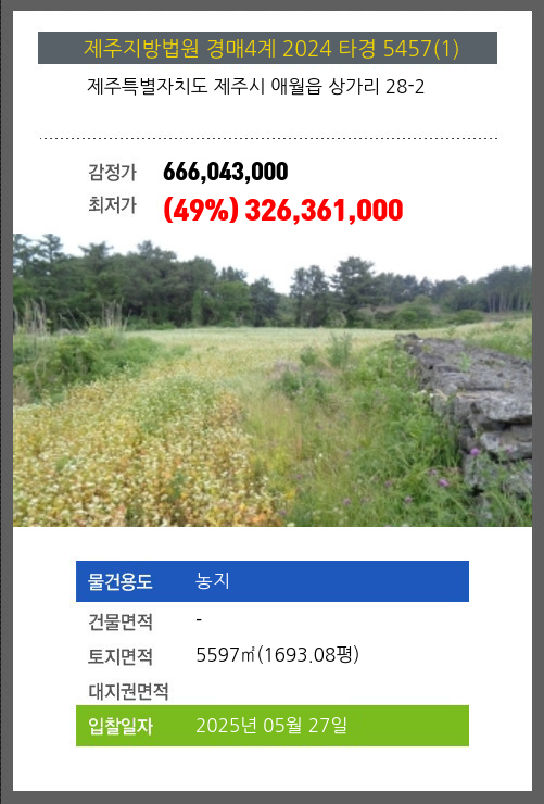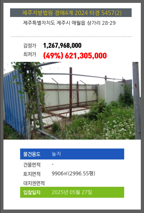 사건번호 2024 타경 5457(2) 본건은 제주특별자치도 제주시 애월읍 상가리 28-29소재하는 농지경매 물건의 포스팅입니다. 토지면적 [ 9906㎡ (2996.55평) ] 시세를 반영한 감정가 1,267,968,000에서2회 유찰되어 감정가 대비