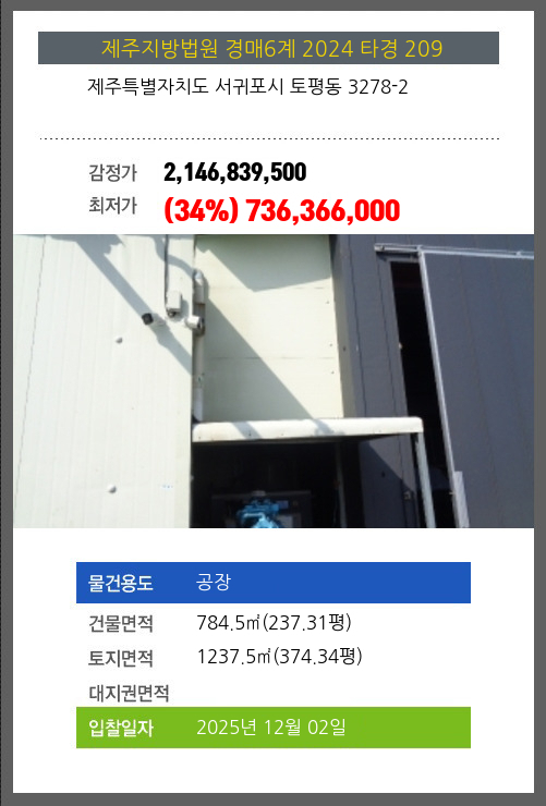 사건번호 2024 타경 209 본건은 제주특별자치도 서귀포시 토평동 3278-2소재하는 공장경매 물건의 포스팅입니다. 건물면적 [ 784.5㎡ (237.31평) ]토지면적 [ 1237.5㎡ (374.34평) ] 시세를 반영한 감정가 2,146,839,500에서1회