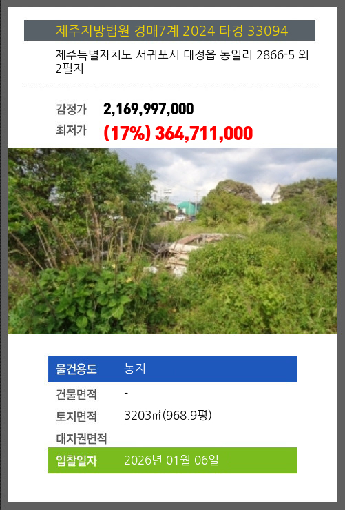 사건번호 2024 타경 33094 본건은 제주특별자치도 서귀포시 대정읍 동일리 2866-5 외 2필지소재하는 농지경매 물건의 포스팅입니다. 토지면적 [ 3203㎡ (968.9평) ] 시세를 반영한 감정가 2,169,997,000에서5회 유찰되어