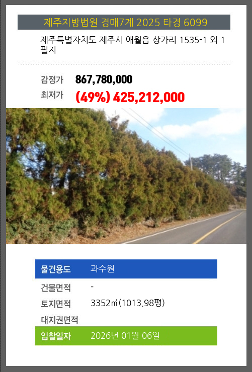 사건번호 2025 타경 6099 본건은 제주특별자치도 제주시 애월읍 상가리 1535-1 외 1필지소재하는 과수원경매 물건의 포스팅입니다. 토지면적 [ 3352㎡ (1013.98평) ] 시세를 반영한 감정가 867,780,000에서3회 유찰되어