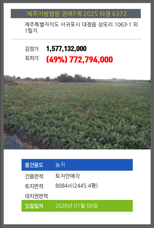 사건번호 2025 타경 6372 본건은 제주특별자치도 서귀포시 대정읍 상모리 1063-1 외 1필지소재하는 농지경매 물건의 포스팅입니다. 건물면적 [ 토지만매각 ]토지면적 [ 8084㎡ (2445.4평) ] 시세를 반영한