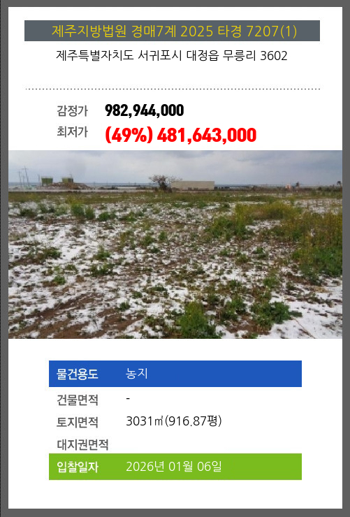 사건번호 2025 타경 7207(1) 본건은 제주특별자치도 서귀포시 대정읍 무릉리 3602소재하는 농지경매 물건의 포스팅입니다. 토지면적 [ 3031㎡ (916.87평) ] 시세를 반영한 감정가 982,944,000에서3회 유찰되어 감정가 대비