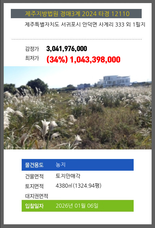 사건번호 2024 타경 12110 본건은 제주특별자치도 서귀포시 안덕면 사계리 333 외 1필지소재하는 농지경매 물건의 포스팅입니다. 건물면적 [ 토지만매각 ]토지면적 [ 4380㎡ (1324.94평) ] 시세를 반영한