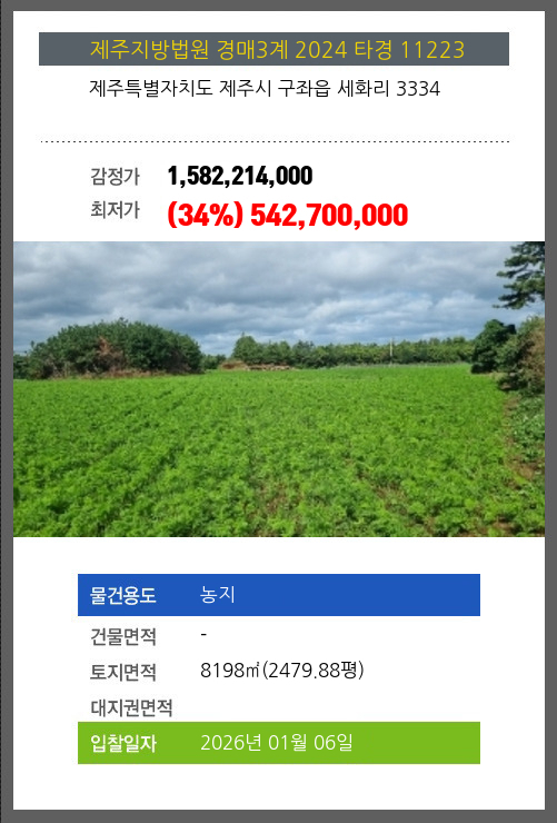 사건번호 2024 타경 11223 본건은 제주특별자치도 제주시 구좌읍 세화리 3334소재하는 농지경매 물건의 포스팅입니다. 토지면적 [ 8198㎡ (2479.88평) ] 시세를 반영한 감정가 1,582,214,000에서3회 유찰되어 감정가 대비
