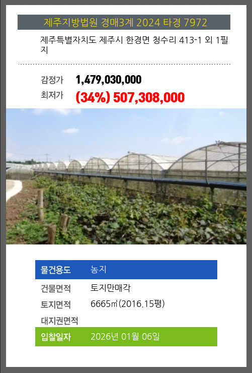 사건번호 2024 타경 7972 본건은 제주특별자치도 제주시 한경면 청수리 413-1 외 1필지소재하는 농지경매 물건의 포스팅입니다. 건물면적 [ 토지만매각 ]토지면적 [ 6665㎡ (2016.15평) ] 시세를 반영한