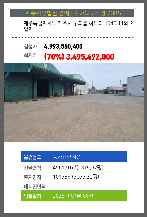 사건번호 2025 타경 7085 본건은 제주특별자치도 제주시 구좌읍 하도리 1046-11외 2필지소재하는 농가관련시설경매 물건의 포스팅입니다. 건물면적 [ 4561.91㎡ (1379.97평) ]토지면적 [ 10173㎡ (3077.32평) ] 시세를 반영한