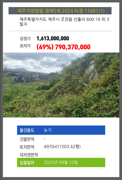 사건번호 2024 타경 11681(1) 본건은 제주특별자치도 제주시 조천읍 선흘리 600-16 외 3필지소재하는 농지경매 물건의 포스팅입니다. 토지면적 [ 4970㎡ (1503.42평) ] 시세를 반영한 감정가 1,613,000,000에서2회 유찰되어