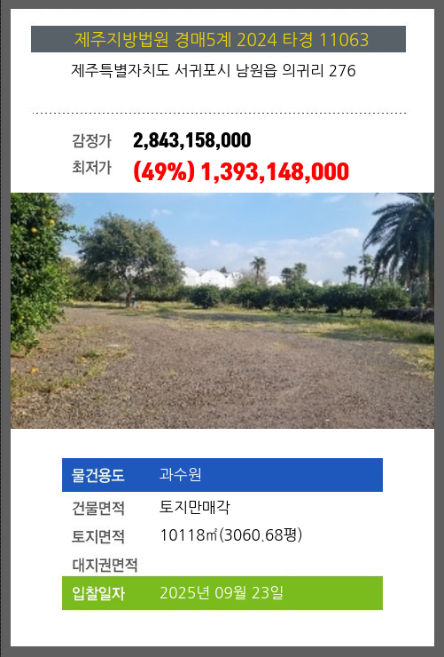 사건번호 2024 타경 11063 본건은 제주특별자치도 서귀포시 남원읍 의귀리 276소재하는 과수원경매 물건의 포스팅입니다. 건물면적 [ 토지만매각 ]토지면적 [ 10118㎡ (3060.68평) ] 시세를 반영한 감정가 2,843,158,000에서2회