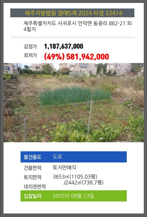 사건번호 2024 타경 33414 본건은 제주특별자치도 서귀포시 안덕면 동광리 862-21 외 4필지소재하는 도로경매 물건의 포스팅입니다. 건물면적 [ 토지만매각 ]토지면적 [ 전체:3653㎡ (1105.03평) 매각지분:2442㎡ (738.7평) ]