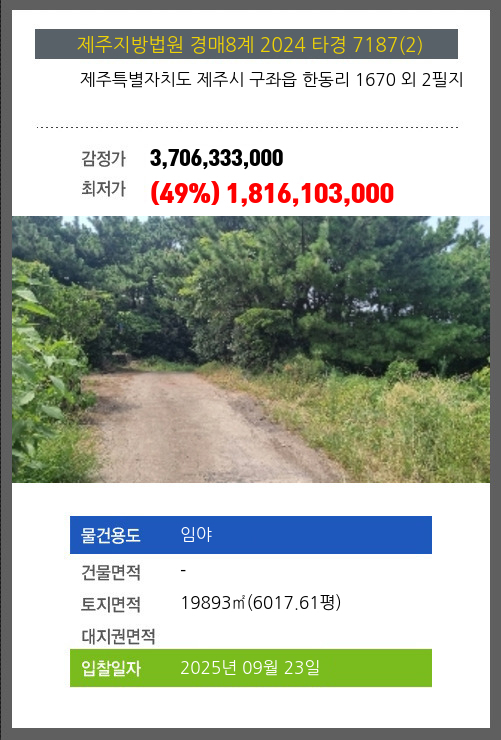 사건번호 2024 타경 7187(2) 본건은 제주특별자치도 제주시 구좌읍 한동리 1670 외 2필지소재하는 임야경매 물건의 포스팅입니다. 토지면적 [ 19893㎡ (6017.61평) ] 시세를 반영한 감정가 3,706,333,000에서2회 유찰되어
