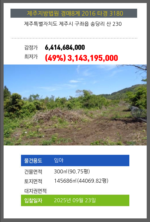 사건번호 2016 타경 3180 본건은 제주특별자치도 제주시 구좌읍 송당리 산 230소재하는 임야경매 물건의 포스팅입니다. 건물면적 [ 300㎡ (90.75평) ]토지면적 [ 145686㎡ (44069.82평) ] 시세를 반영한