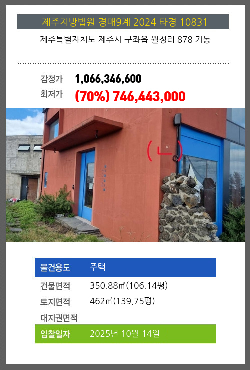 사건번호 2024 타경 10831 본건은 제주특별자치도 제주시 구좌읍 월정리 878 가동소재하는 주택경매 물건의 포스팅입니다. 건물면적 [ 350.88㎡ (106.14평) ]토지면적 [ 462㎡ (139.75평) ] 시세를 반영한
