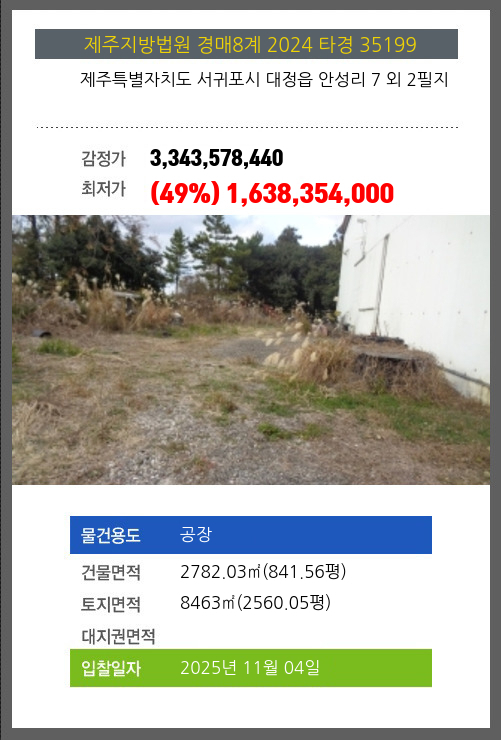사건번호 2024 타경 35199 본건은 제주특별자치도 서귀포시 대정읍 안성리 7 외 2필지소재하는 공장경매 물건의 포스팅입니다. 건물면적 [ 2782.03㎡ (841.56평) ]토지면적 [ 8463㎡ (2560.05평) ] 시세를