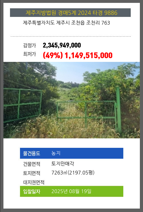사건번호 2024 타경 9886 본건은 제주특별자치도 제주시 조천읍 조천리 763소재하는 농지경매 물건의 포스팅입니다. 건물면적 [ 토지만매각 ]토지면적 [ 7263㎡ (2197.05평) ] 시세를 반영한 감정가 2,345,949,000에서2회