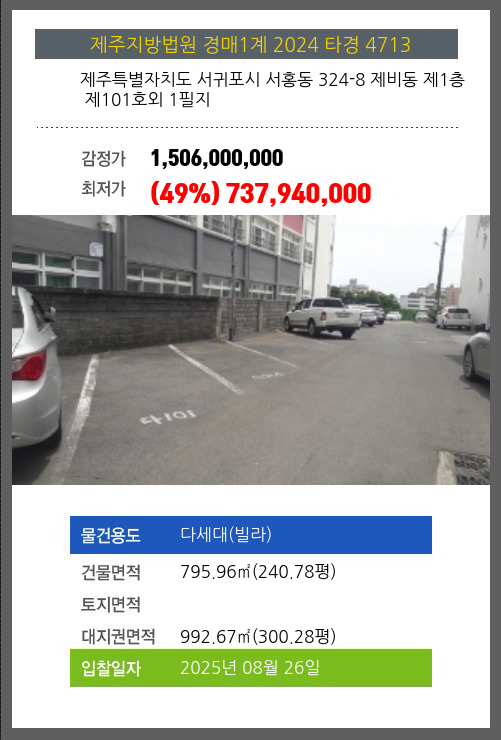 사건번호 2024 타경 4713 본건은 제주특별자치도 서귀포시 서홍동 324-8 제비동 제1층 제101호외 1필지소재하는 다세대(빌라)경매 물건의 포스팅입니다. 건물면적 [ 795.96㎡ (240.78평) ]대지권 [ 992.67㎡ (300.28평) ]