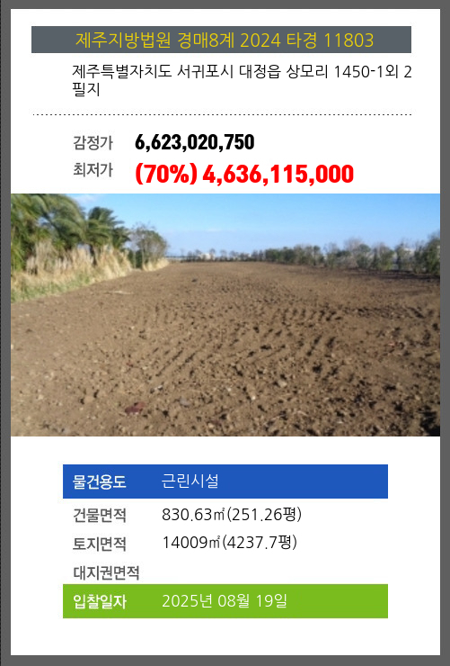 사건번호 2024 타경 11803 본건은 제주특별자치도 서귀포시 대정읍 상모리 1450-1외 2필지소재하는 근린시설경매 물건의 포스팅입니다. 건물면적 [ 830.63㎡ (251.26평) ]토지면적 [ 14009㎡ (4237.7평) ] 시세를 반영한