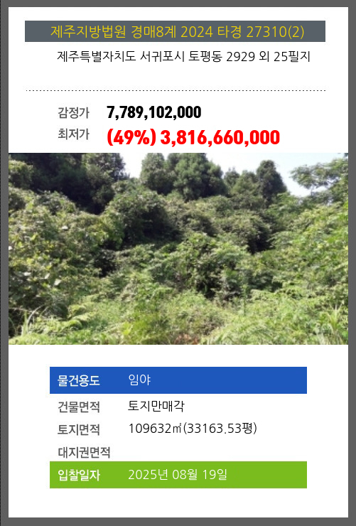 사건번호 2024 타경 27310(2) 본건은 제주특별자치도 서귀포시 토평동 2929 외 25필지소재하는 임야경매 물건의 포스팅입니다. 건물면적 [ 토지만매각 ]토지면적 [ 109632㎡ (33163.53평) ] 시세를 반영한 감정가