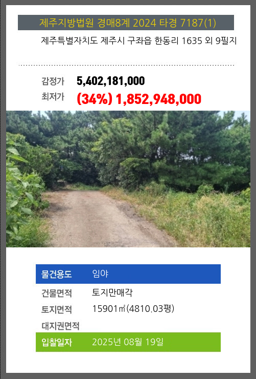 사건번호 2024 타경 7187(1) 본건은 제주특별자치도 제주시 구좌읍 한동리 1635 외 9필지소재하는 임야경매 물건의 포스팅입니다. 건물면적 [ 토지만매각 ]토지면적 [ 15901㎡ (4810.03평) ] 시세를 반영한