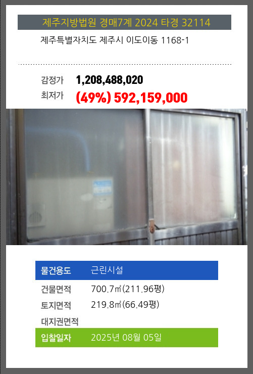 사건번호 2024 타경 32114 본건은 제주특별자치도 제주시 이도이동 1168-1소재하는 근린시설경매 물건의 포스팅입니다. 건물면적 [ 700.7㎡ (211.96평) ]토지면적 [ 219.8㎡ (66.49평) ] 시세를 반영한 감정가 1,208,488,020에서2회