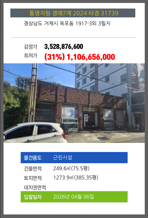 사건번호 2024 타경 31739 본건은 경상남도 거제시 옥포동 1917-3외 3필지소재하는 근린시설경매 물건의 포스팅입니다. 건물면적 [ 249.6㎡ (75.5평) ]토지면적 [ 1273.9㎡ (385.35평) ] 시세를 반영한 감정가